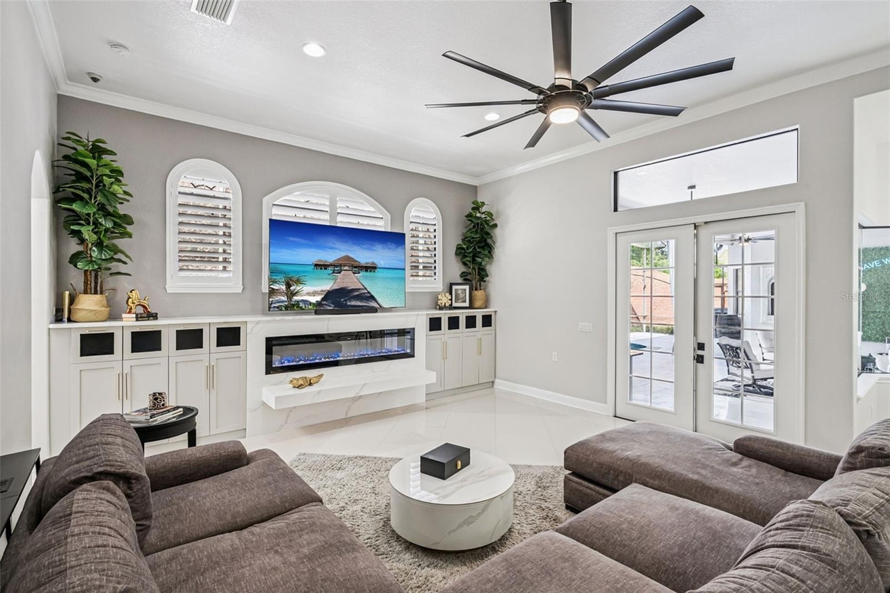 - Family Room — Casual gathering space with fireplace and pool views