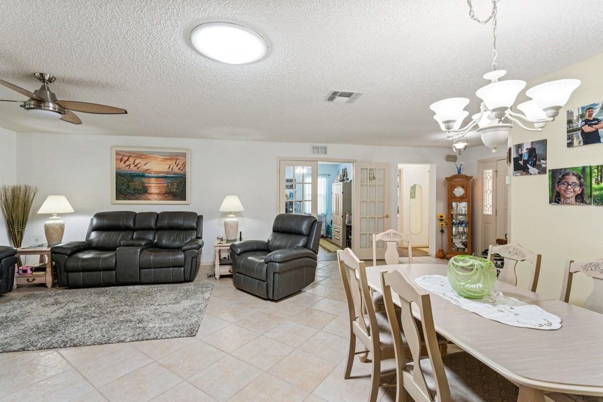 One of the most appealing aspects of this Ocala home is the large open spaces with high ceilings that allow natural light to flow throughout all the rooms. Tall ceilings make spaces feel larger and more inviting, while wide windows ensure that even on overcast days, you never feel closed in. The living room/dining room combination is particularly impressive — with a skylight adding even more natural brightness, it's the kind of space that makes hosting holiday dinners or family gatherings genuinely enjoyable.