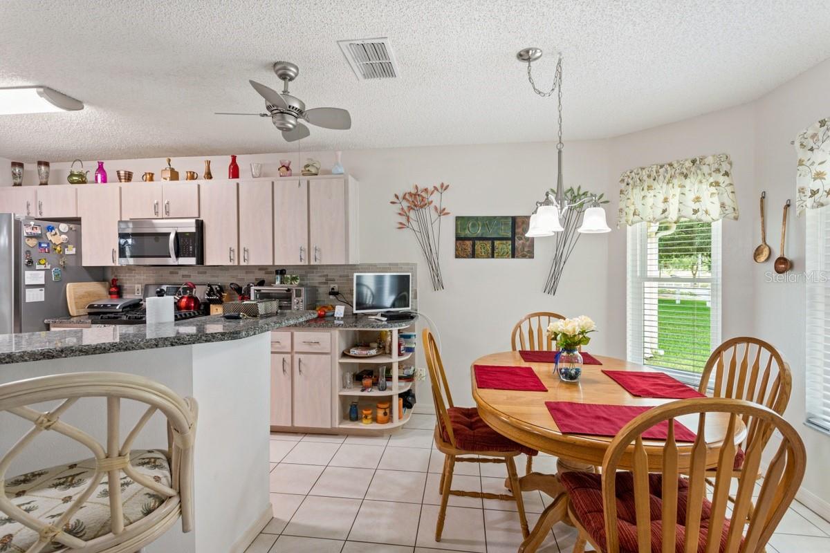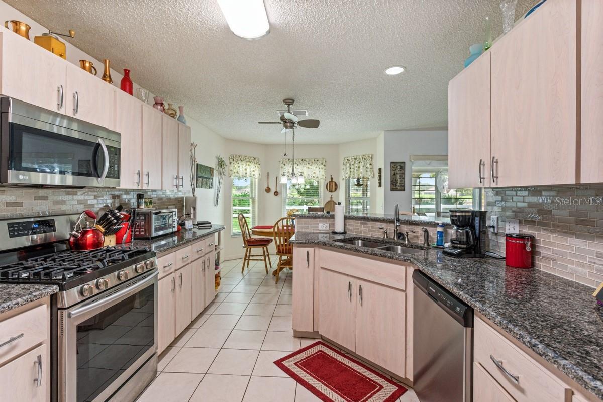 Any home chef will appreciate the large modern kitchen with stainless steel appliances. The open layout means the kitchen naturally connects to the breakfast nook, creating a natural gathering spot for family and friends. The breakfast nook features large bay windows that frame the view of your beautifully landscaped yard and the golf course beyond — it's the kind of setting that makes even simple weekday breakfasts feel like a treat.